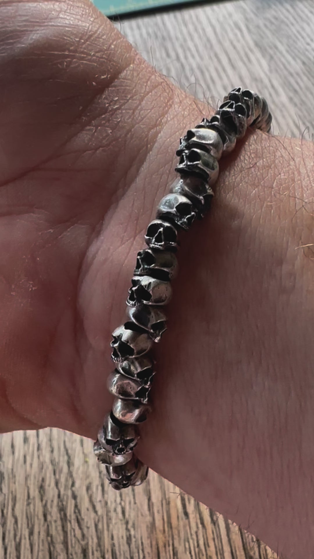 The catacomb bracelet is reminiscent of times gone by. It features a continuous line of small aging skulls, drawing inspiration from the catacombs of Paris. It can serve as a piece of modern day memento mori. Each hand sculpted and fabricated bracelet is cast in sterling silver, patinated to darken the recesses, finished by hand, and strung on a hand fabricated, sterling silver snake chain with a strong spring clasp. The beads can freely rotate around the inner chain as the bracelet is worn. Other lengths are available by custom order. Slight variations will naturally occur.