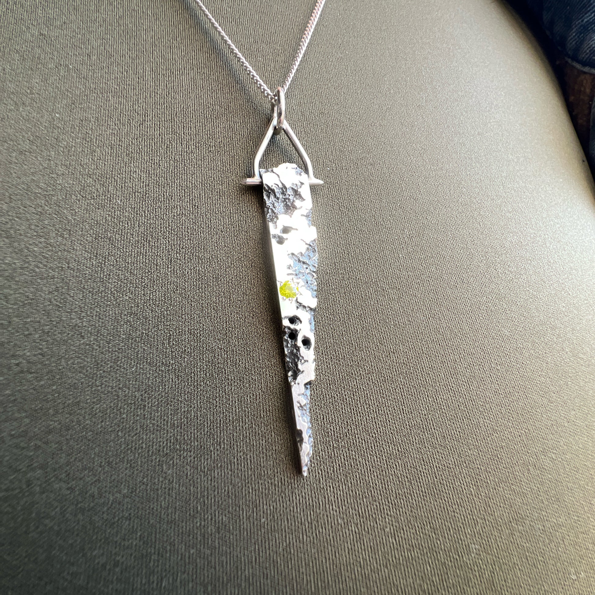 Another addition to the decay collection, here is a pendant version of the original decay rings. The decay pendants consist of a flat, 8mm wide bar that is drilled across its width, and installed with a fabricated bail to allow it to hang and move freely. There is one, 3mm GAGG (Gadolinium Aluminum Gallium Garnet) bead-set in the pendant.