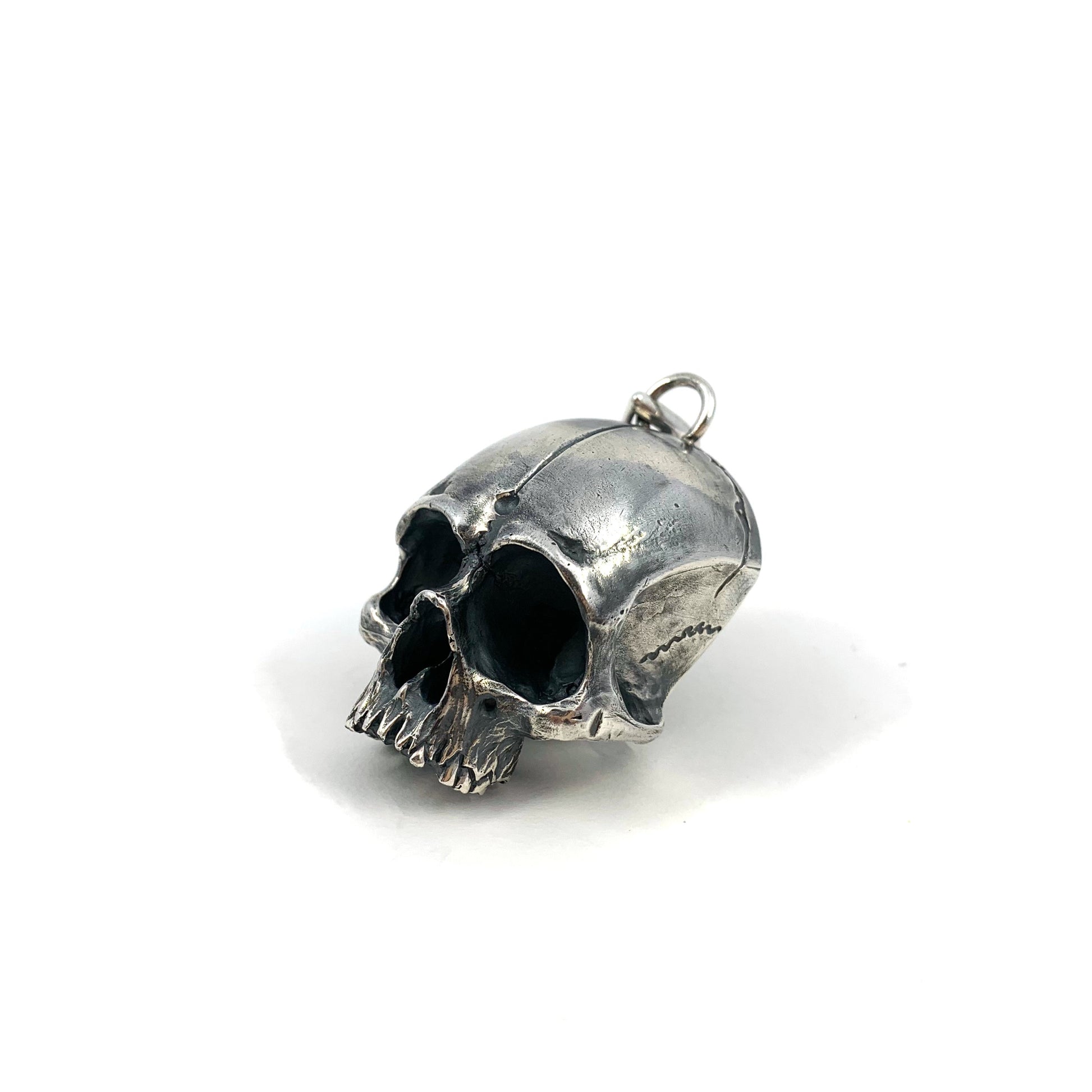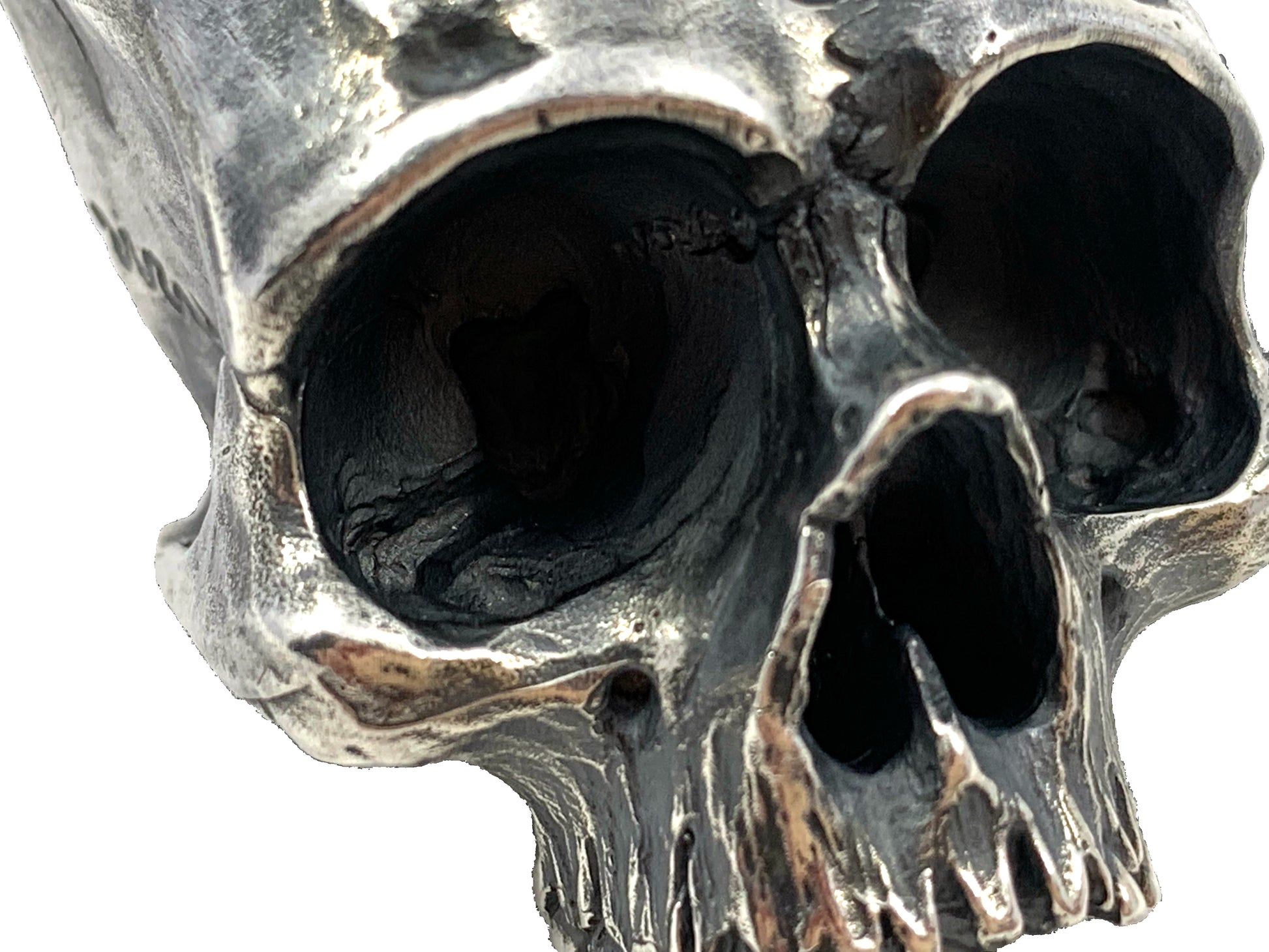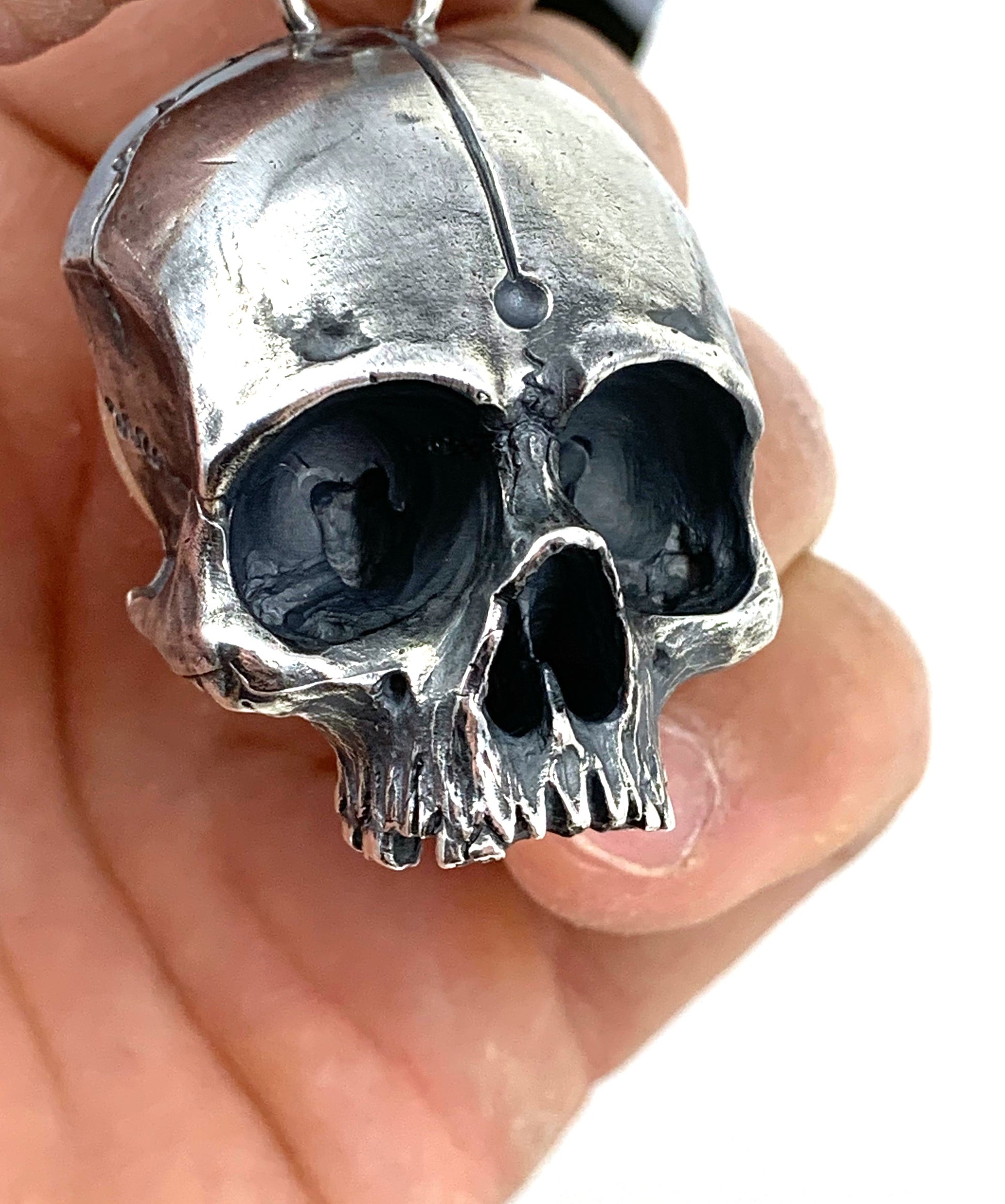 Big ass skull! This monster memento mori piece weighs over 60 grams of solid sterling silver and makes a real statement that will be sure to turn heads. The bail will accommodate large chains and allows for movement that a jump ring alone does not. This pendant was hand carved and then cast, It also has worms carved on the inside. Who wouldn't love that?