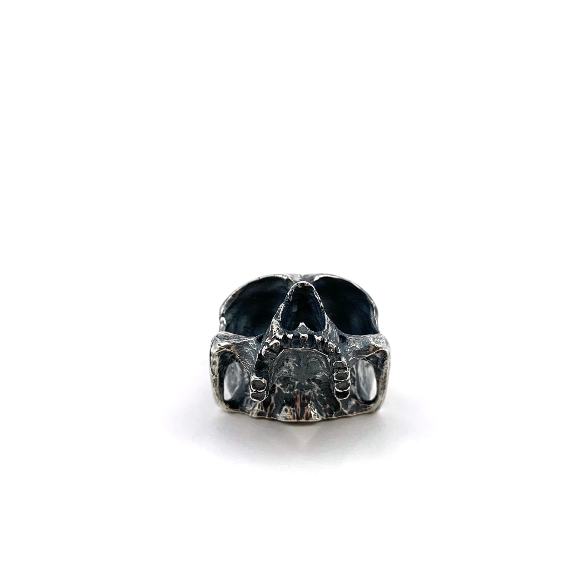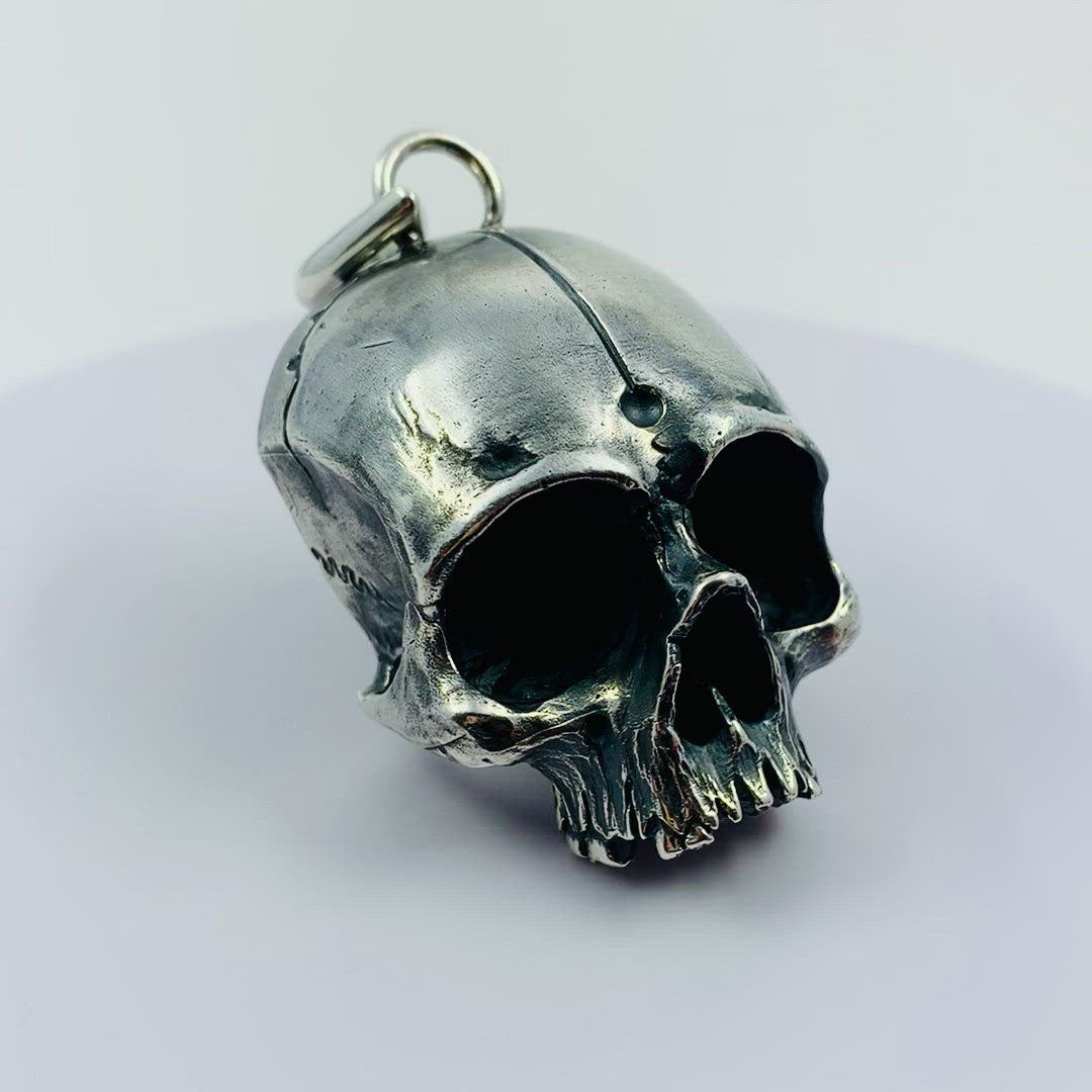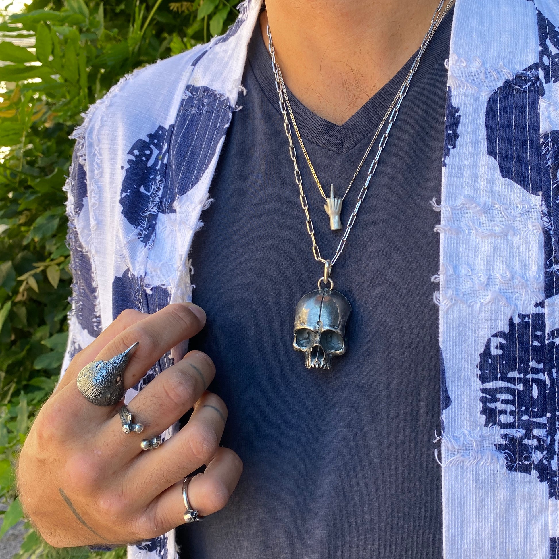 Big ass skull! This monster memento mori piece weighs over 60 grams of solid sterling silver and makes a real statement that will be sure to turn heads. The bail will accommodate large chains and allows for movement that a jump ring alone does not. This pendant was hand carved and then cast, It also has worms carved on the inside. Who wouldn't love that?