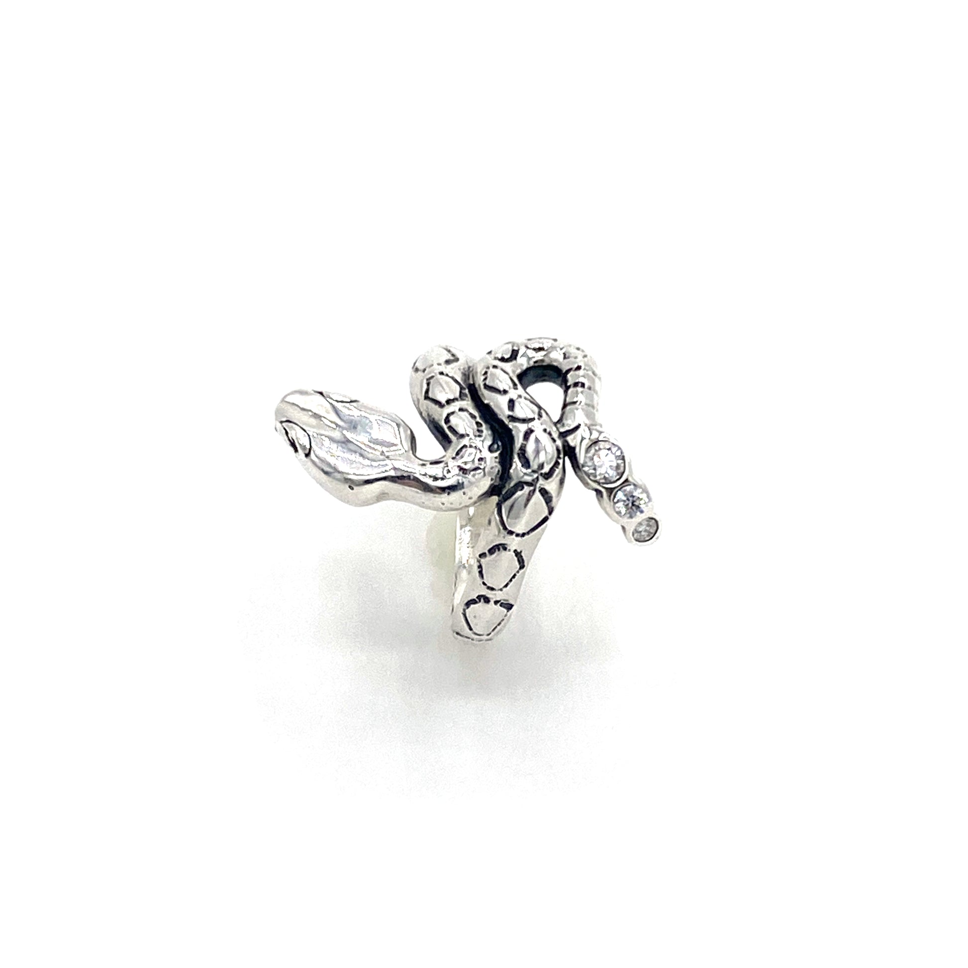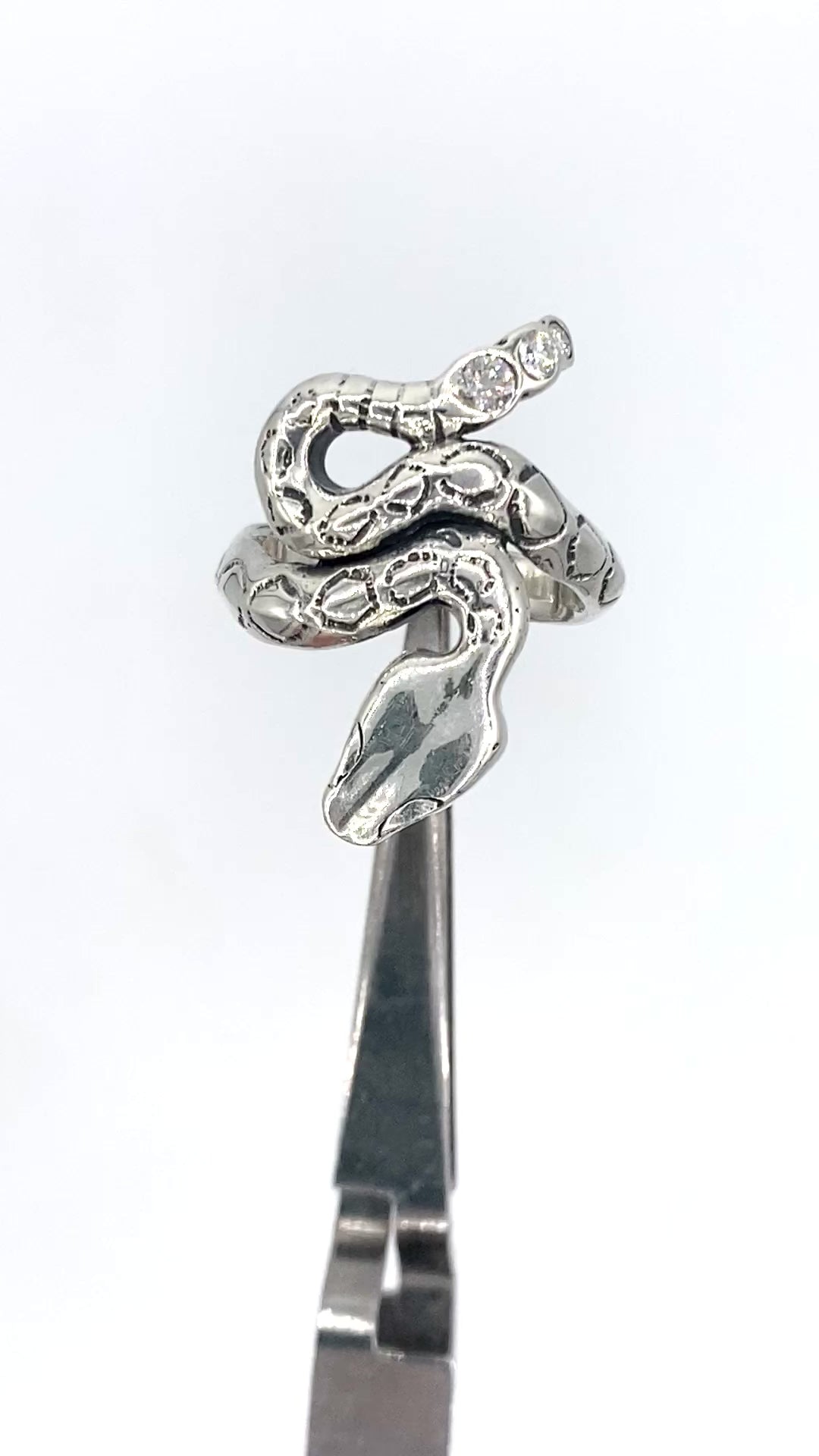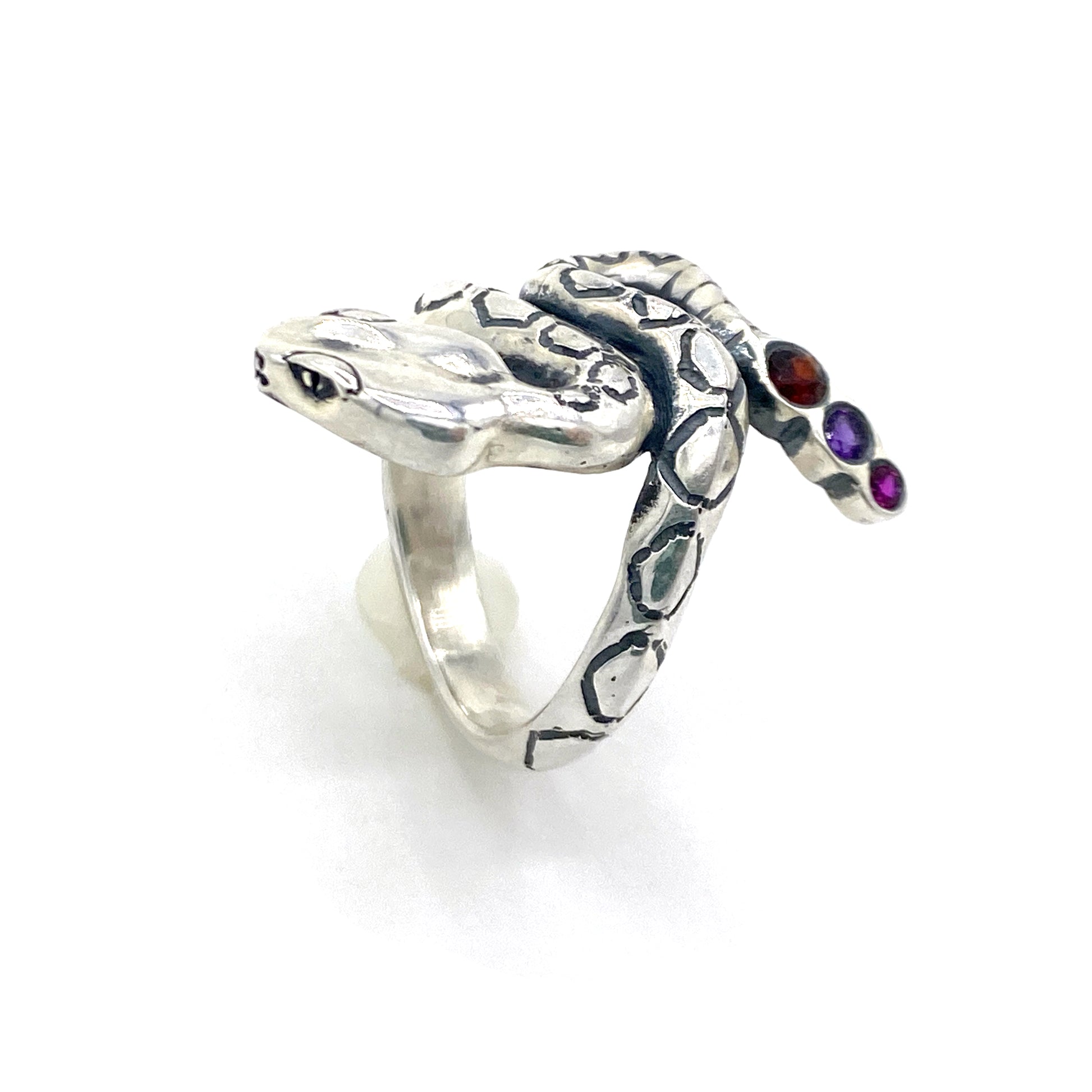 Adding to our various snakes is this Rattlesnake ring! As with our other pieces it is hand carved in wax and then cast in sterling silver. Snake rings, or serpent rings have been popular throughout history, often representing eternal love. This particular design allows three stones to be flush set into the "rattle". Any type of stone can be mixed, matched, or accomodated. If you choose Diamonds, they will be VS-SI, D-G unless otherwise requested. Please get in touch for custom stone combinations. Due to the bespoke nature of the process, slight variations will naturally occur.