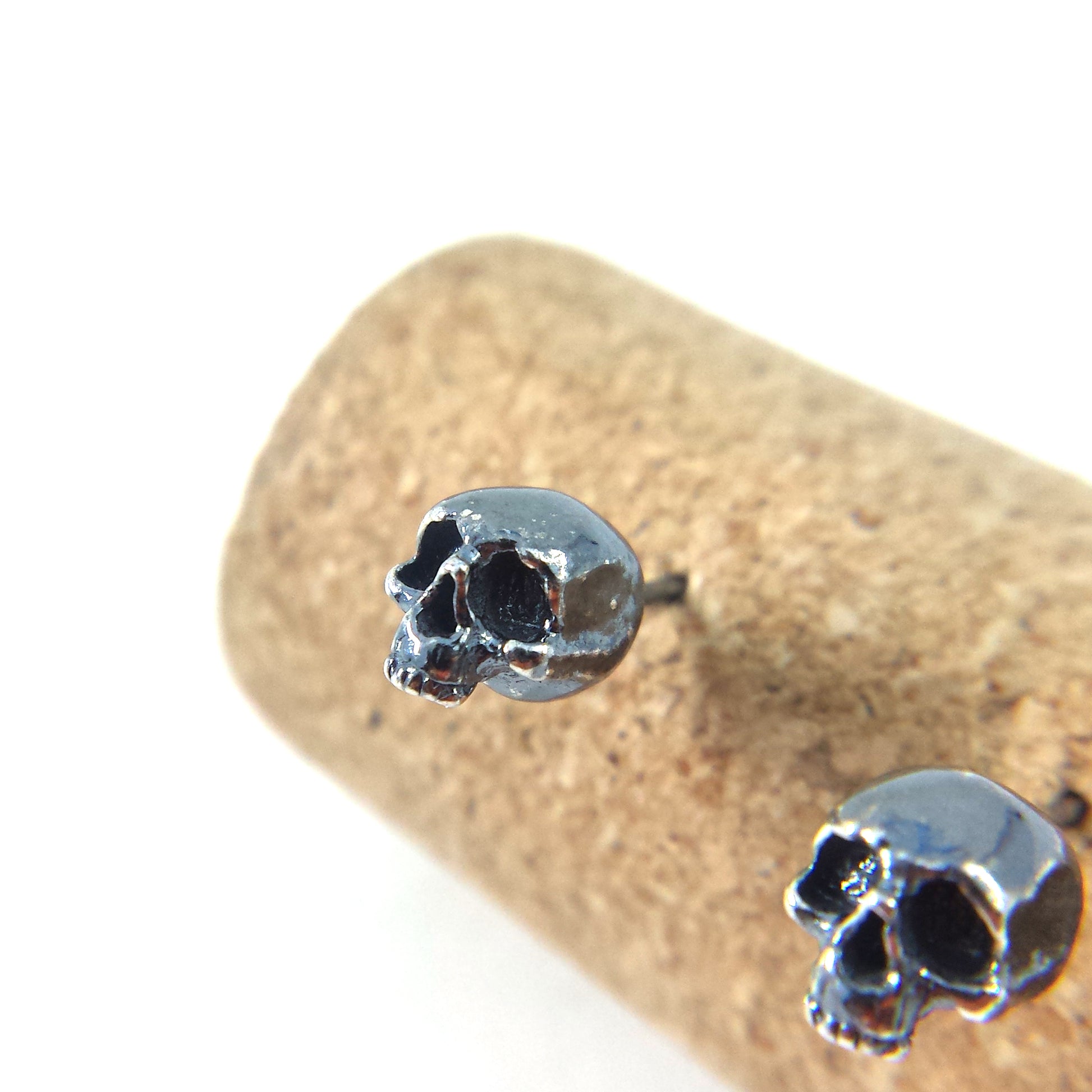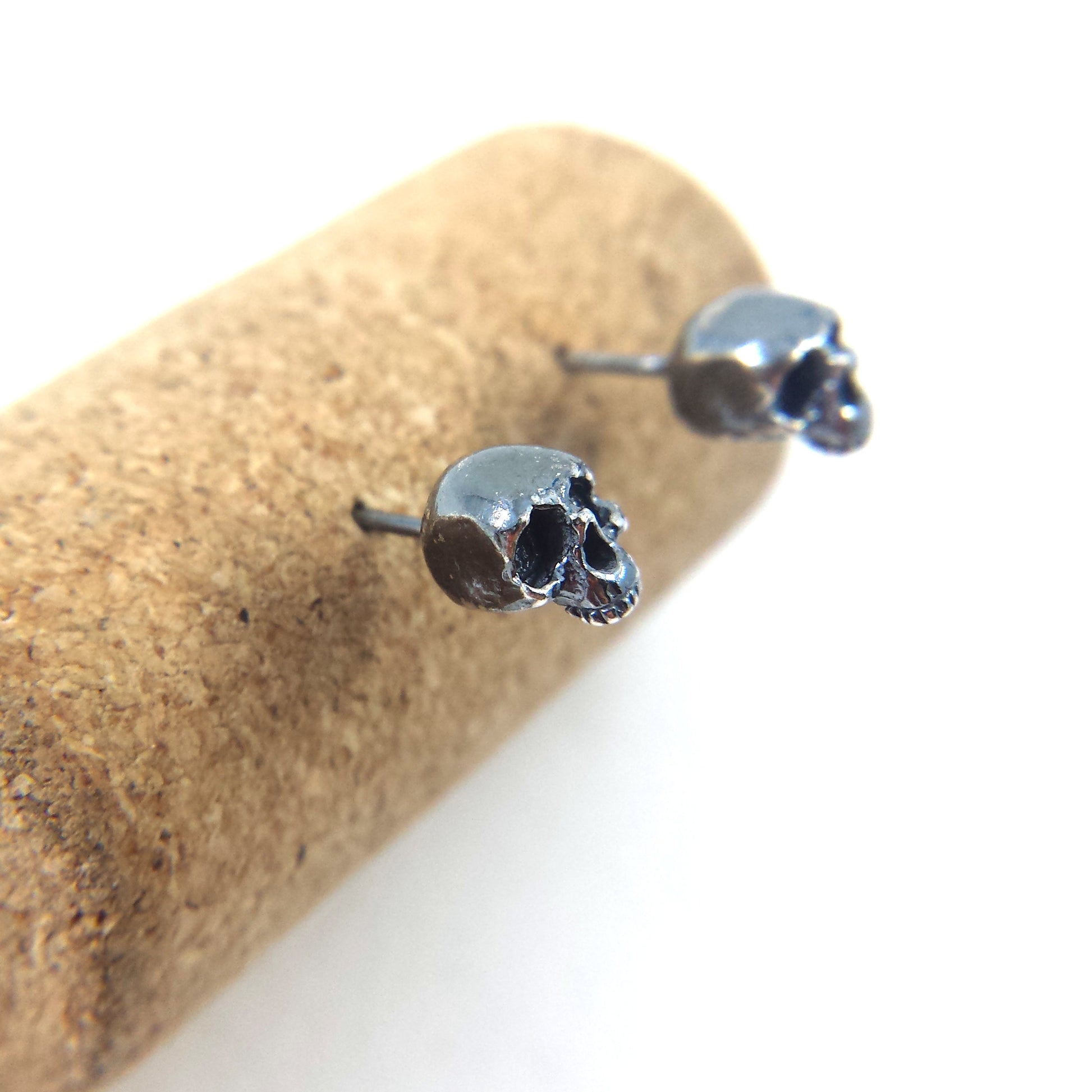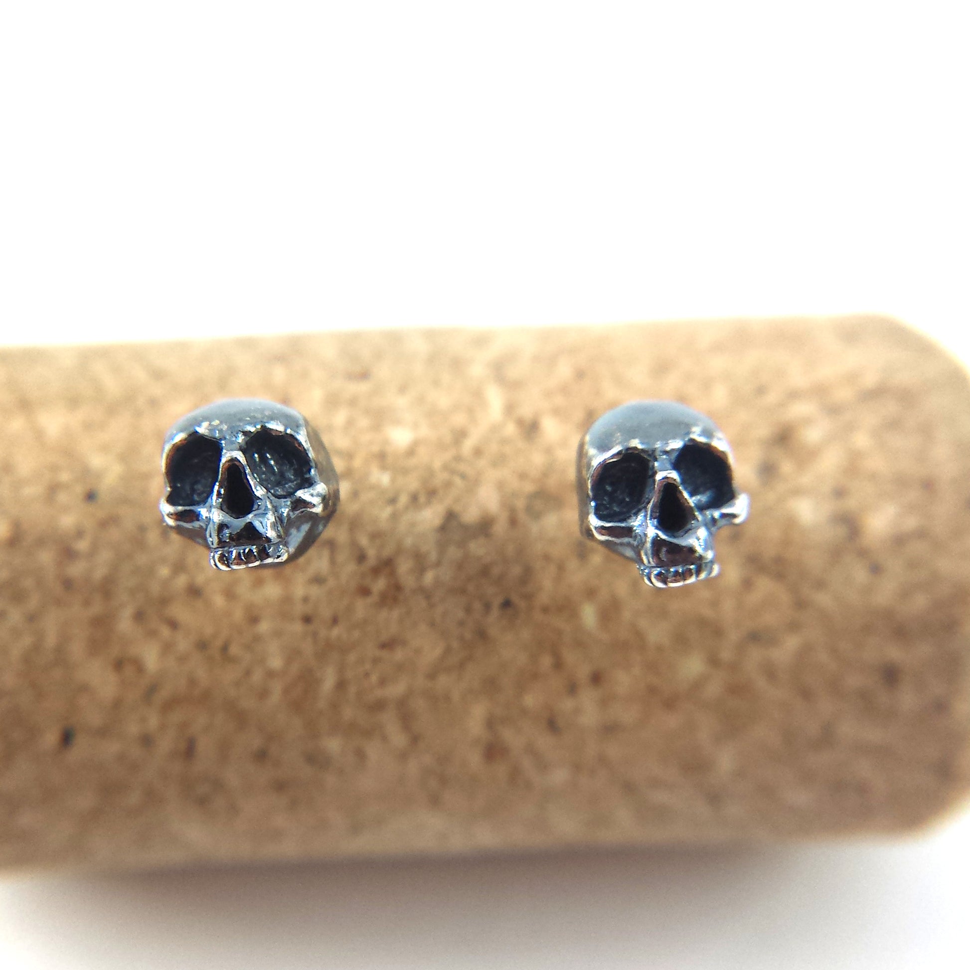 These small earrings are lightweight and look unassuming at first glance. Each set of hand sculpted skull ear studs is cast in sterling silver and finished by hand, including a patina to darken the recesses.
